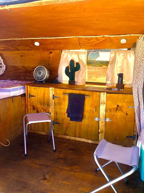 Our Camper Van comes with a Queen size bed, sink, kitchen with one burner stove and utensiles, cooler, pantry, foldable table, two beach chairs, beach umbrella, outdoor shower and a porta potty. The van has a portable battery and usb conection so you can charge your phone and cameras while on the road. With the rental of this van, it´s also included recovery gear like a shovel, traction boards and air compressor.